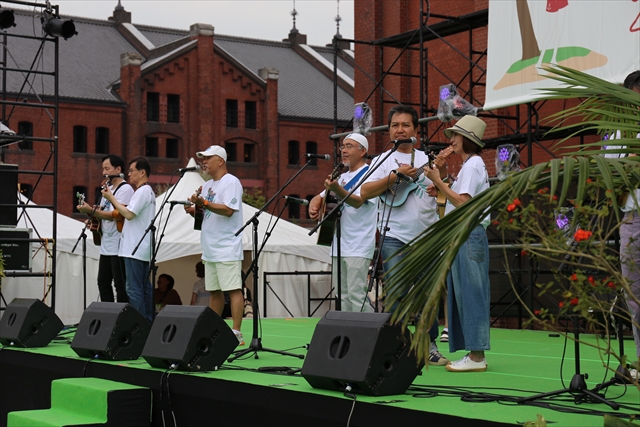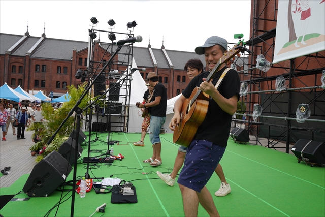RED BRICK RESORT内の砂浜のステージでは、本物の砂浜のうえに出来たステージのうえで、ウクレレラヴァーズの皆さんが
